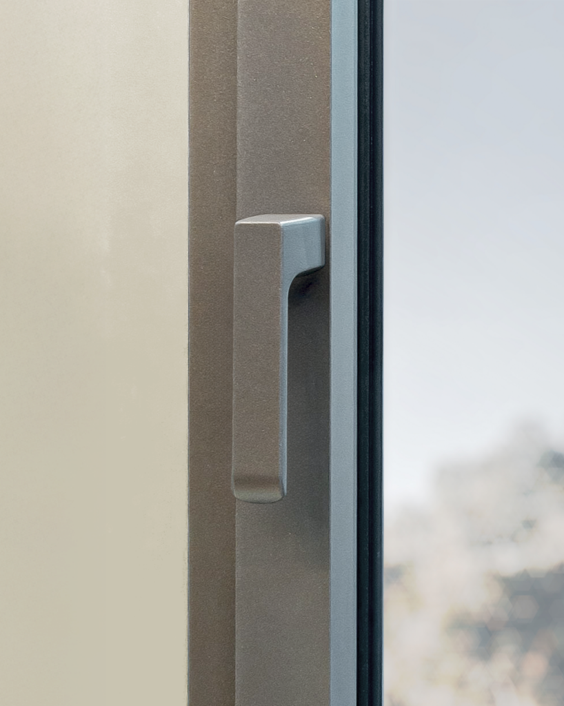Pour une esthétique intérieure soignée, optez pour une poignée centrée sur un battement droit. Cette option, combinée à la parclose aluminium fine, permet de réduire la largeur des montants et donc d’optimiser le clair de vitrage.